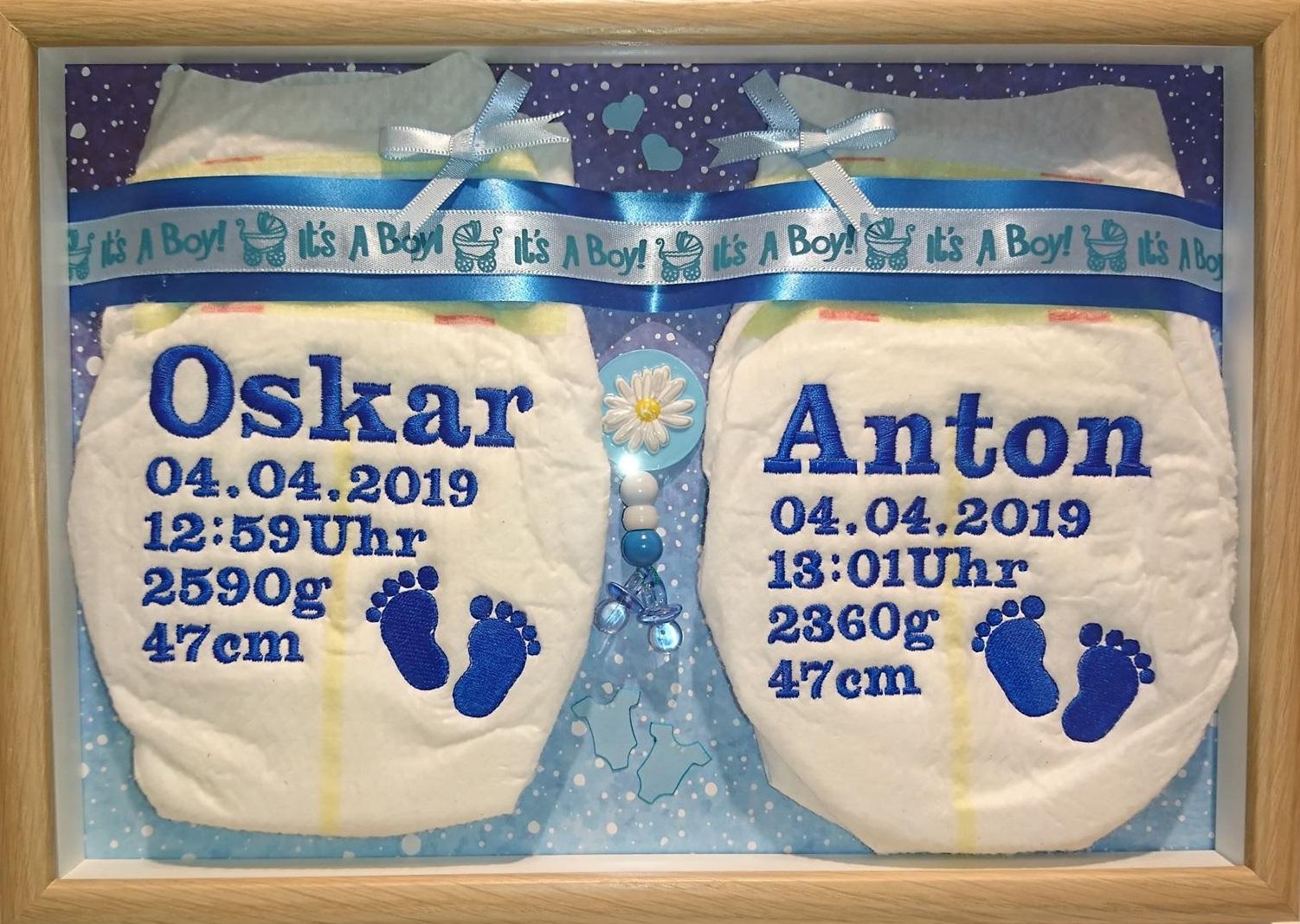 - Liebevolles Design: Zwei Windeln, symbolisch für Geschwister oder Zwillinge, arrangiert in einem hochwertigen 3D-Rahmen.